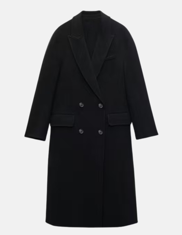 Tailored in rich black wool, this long coat offers warmth with an elevated, clean silhouette. The soft drape and refined structure make it an effortless companion through winter days and crisp evening moments.