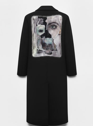 Minimalist from the front, bold in the back — a statement velvet patch brings modern edge and artistic identity, turning a timeless coat into a conversation piece.
