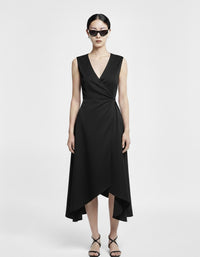 The asymmetrical hemline creates movement with every step, revealing just enough, never too much. A pointed collar adds structure; the sleeveless cut keeps it modern. It’s understated, but unforgettable.